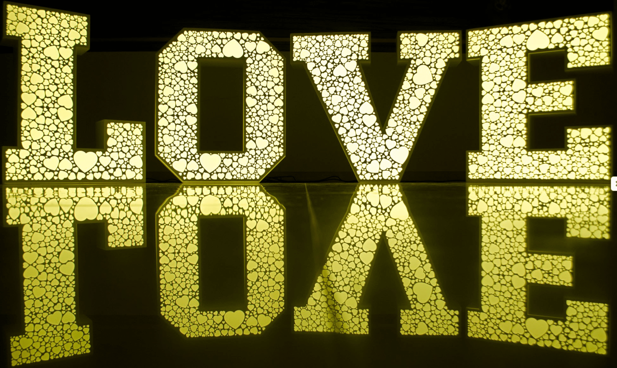 Napis LOVE z ażurowymi sercami to dekoracja, która łączy klasyczną formę z finezyjnym, romantycznym detalem. Podświetlane serca o ażurowej strukturze nadają lekkości i przyciągają wzrok, tworząc idealne tło do zdjęć i nagrań.